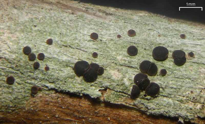Index → Buttons → Bacidia → B. heterochroa Location: British Columbia, Clearwater Valley Date: 2013-02-09 Photo by: Curtis Björk Notes: Bark of Quercus garryana branch near marine shore
