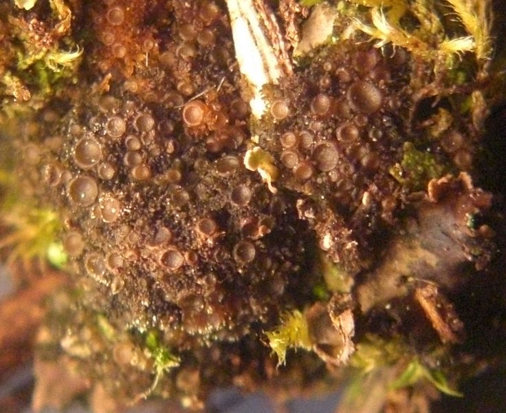 Location: British Columbia, Wells Gray Provincial Park area, Edgewood Research & Education Centre Date: 2011-03-08 Photo by: Curtis Björk Notes: On moss at base of Populus trichocarpa in open Betula-Picea-Pinus-Populus forest; photographed from a specimen