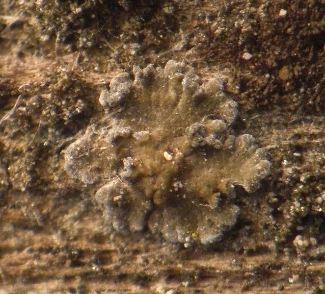Index → Underlays → Parmeliella → P. parvula Location: British Columbia, Clearwater Valley, Dawson Falls Date: 2012-04-08 Photo by: Curtis Björk Notes: On wood of Thuja log suspended over river shore, in waterfall sprayzone